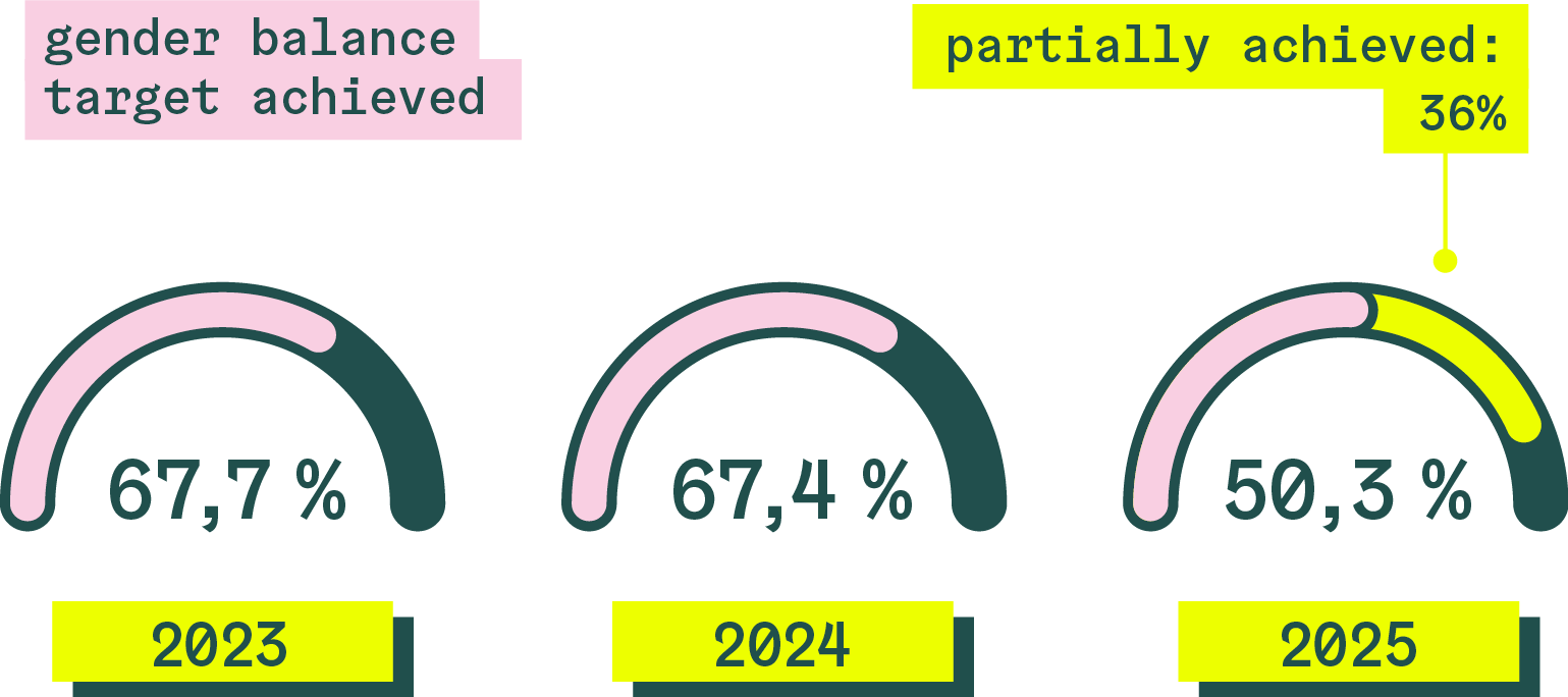 Relatively high gender balance targets achieved: 50.7% of reporting signatories met gender balance targets in 2025, 67.4% in 2024, and 67.7% in 2023. The 2025 survey also introduced a partial-success option, with 36% of respondents reporting progress, showing that the majority of organisations are actively advancing gender equity.