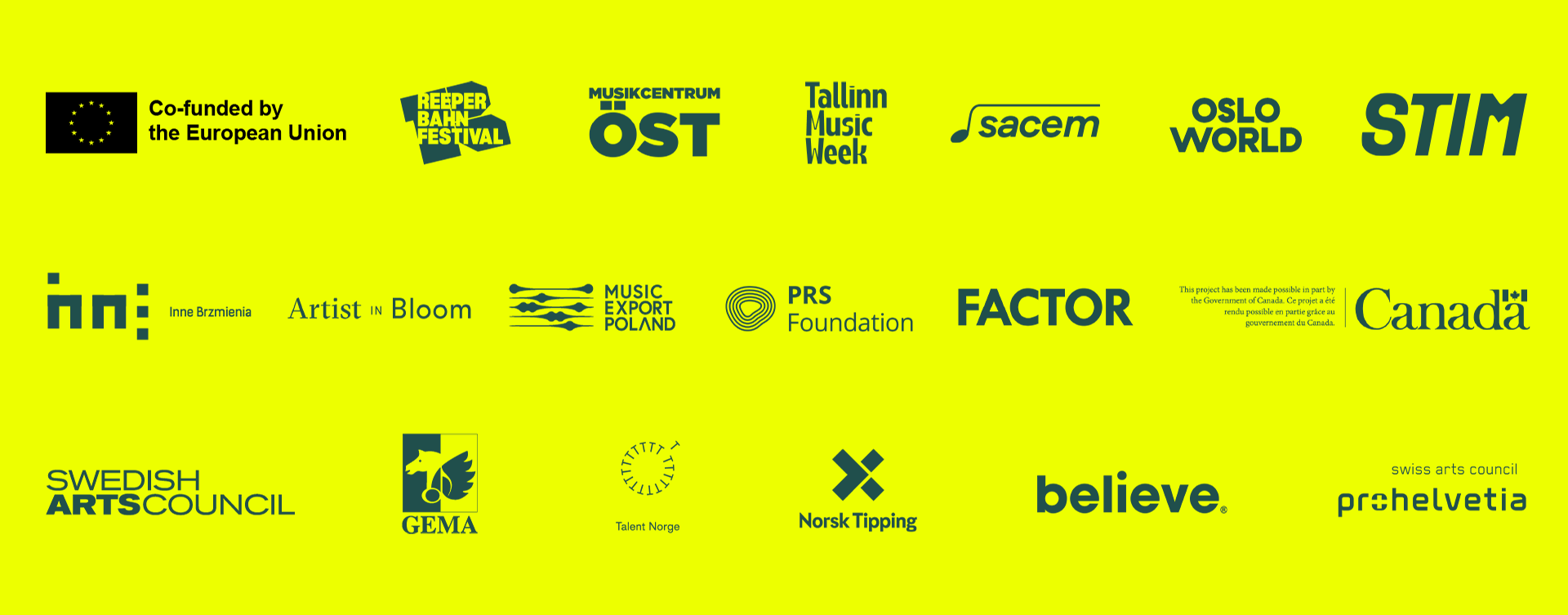 Keychange Leaders partners and supporters are: Reeperbahn Festival/RBX, Shiftworks/Tallinn Music Week, Musikcentrum Öst, Keychange (ASBL), Music Export Poland, SACEM, Oslo World, /Different Sounds Festival/Workshops of Culture Lublin, Artist in Bloom, PRS Foundation, FACTOR, SOCAN Foundation, STIM, Arts Council of Sweden, GEMA, the Swiss Arts Council Pro Helvetia, and Talent Norge.